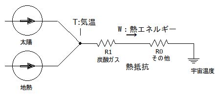 による熱抵抗とするとR0はそれ以外の熱抵抗で、Wは地球が得られる太陽からの熱エネルギーと地球内部による熱