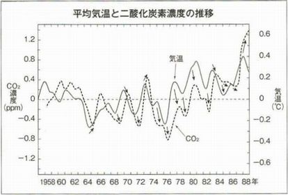 因みに、図2に示す1958年から1988年の間の気温と炭酸ガス濃度のグラフでは、僅か-0.8〜1.3ppmの変動に気温が-0.3〜0.4度で追従しています。やはり丸山茂徳教授が言うように、気温が上がると海水中の二酸化炭素が抜ける説が正しいように思います。実際、二酸化炭素は気温の上下に遅れて追従してるように見えます。