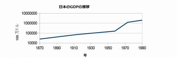 ついでに、1870年から1980年までの日本のGDPの推移を図2(注1)に示します。かなり図1の実質債務残高(赤破線)の上昇とGDPの上昇が重なっている事が分ると思います。つまり日本のGDP上昇の原動力の殆どは国が借金して市場にお金を増やしてくれたからです。